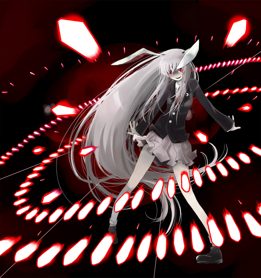 1girlanimal earsdanmakufemale focusfull bodygradient backgroundlong hairpurple hairrabbit earsred eyesskirtsolo