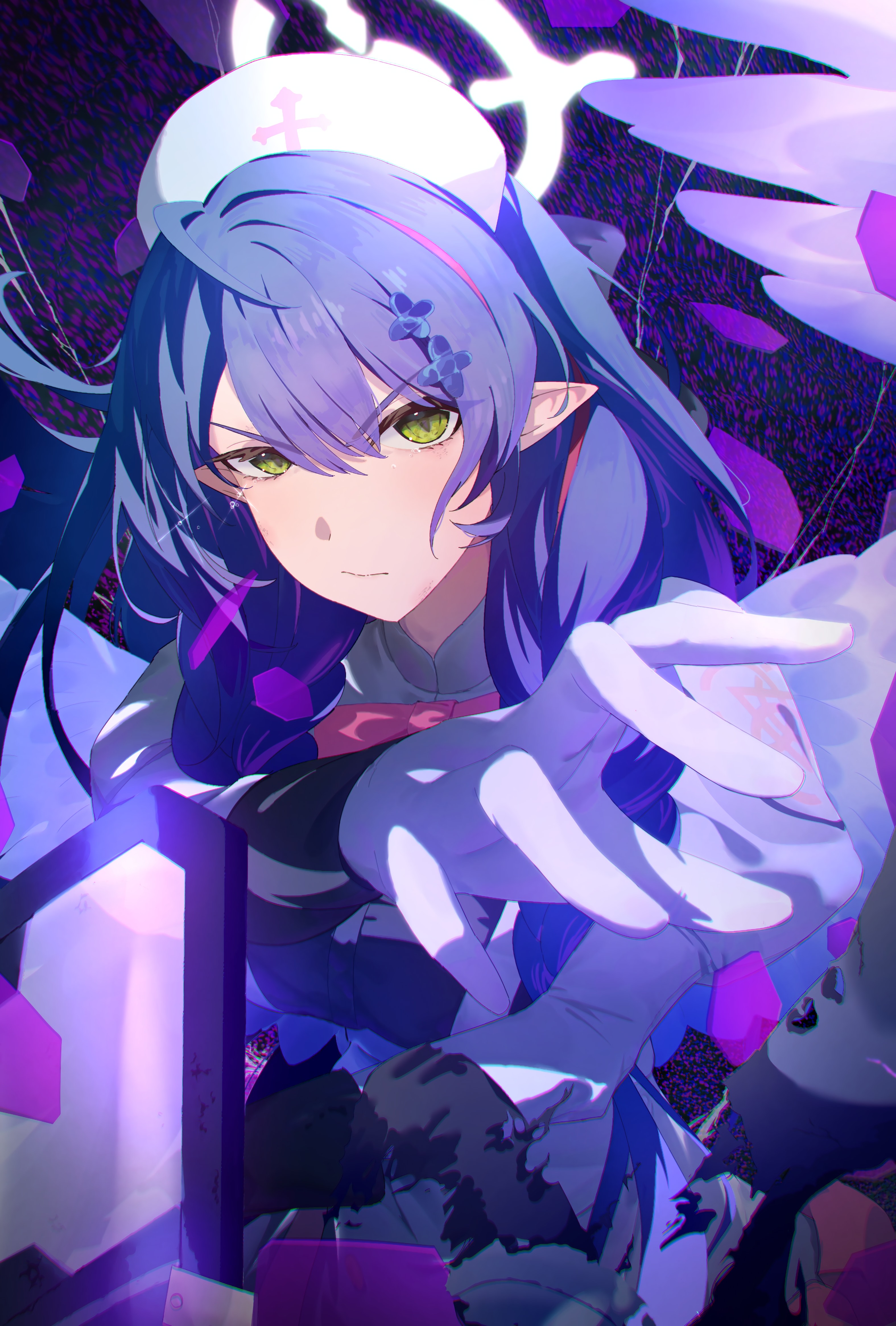 shiina taki, yahata umiri, yahata umiri (moonlight executioner), arknights, bang dream!, bang dream! it's mygo!!!!!, commentary, hashtag-only commentary, highres, 2girls, animal ears, atsubomi, black boots, black dress, black gloves, black hair, black hat, black thighhighs, blue eyes, blurry, boots, brown coat, brown hat, chain, closed mouth, coat, depth of field, dress, full moon, gloves, hat, holding carton, long hair, magnifying glass, moon, multiple girls, red gloves, sleeveless, sleeveless dress, thighhighs, window, wolf ears, wolf girl