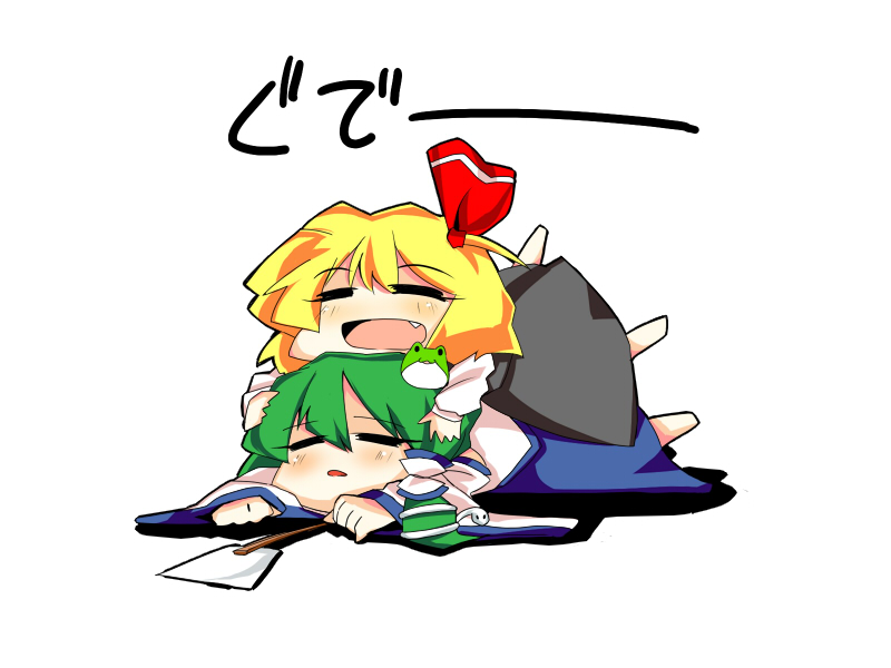 2girlsblonde hairbowchibichin restclosed eyesfangfemale focusglompgoheigreen hairhair bowhead on headhuglyingmultiple girlsopen mouth