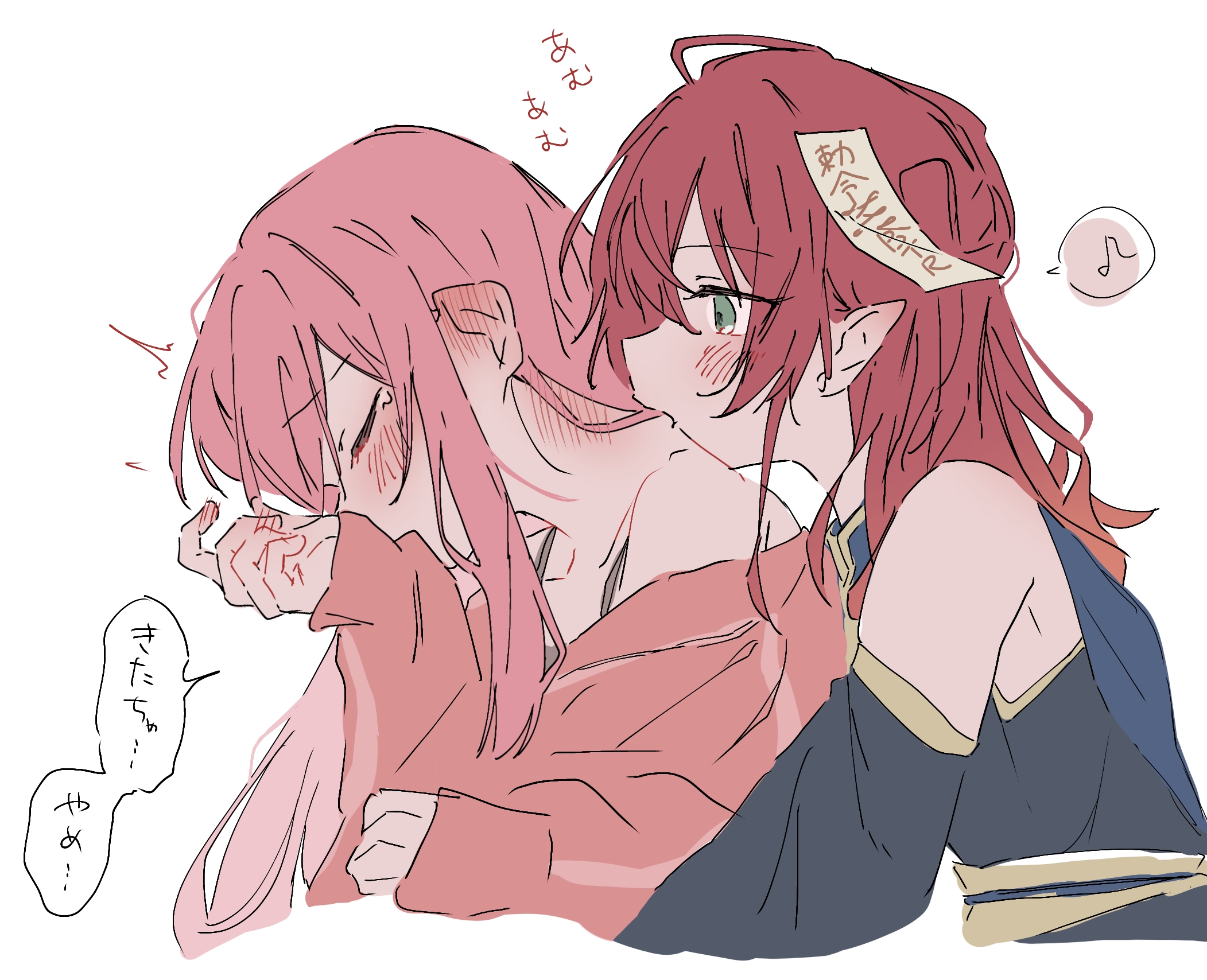 2girlsblack robeblue capeblushcapechinese clothesdetached sleevesear blushkisskissing necklong hairmultiple girlsmusical noteneck blushoff shoulderoff-shoulder sweaterofudaofuda on headpink hairred hairrobesimple backgroundsleeve over mouthsleeveless robespoken musical notesweatertearing upwhite backgroundyellow eyesyuri