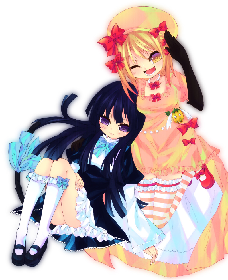 00s2girlsblonde hairblue hairblushcat taildresselbow glovesgemgloveshappyhatlong hairmultiple girlsone eye closedpearl (gemstone)pink dresspink hatpumpkinpunpkimpurple eyesribbonseriousshort hairsittingsmilesockstailvery long hairwinkyellow eyes