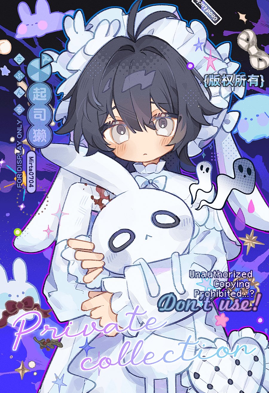 scaramouche (genshin impact), genshin impact, original, artist request, commission, hair ornament request, highres, second-party source, 1boy, 1girl, ahoge, alternate costume, black coat, black gloves, black hair, black sleeves, blunt ends, border, bow, chinese clothes, closed mouth, cloud, coat, commissioner insert, couple, crossed bangs, detached sleeves, eyeliner, eyeshadow, flower, gloves, gold trim, grey background, hair between eyes, hair bow, hair ornament, hair ribbon, hairclip, half gloves, hayami momo (hayamimomo), hetero, holding, holding scroll, layered sleeves, long hair, looking at another, makeup, mandarin collar, mole, mole under eye, monocle, oc x canon, panda hair ornament, pink bow, pink eyes, pink ribbon, pom pom (clothes), pom pom hair ornament, puffy sleeves, purple eyes, red eyeliner, red eyeshadow, ribbon, scroll, semi-rimless eyewear, short sleeves, sleeve over mouth, sleeves past fingers, sleeves past wrists, tassel, white border, white flower, white hair, white sleeves, wide sleeves, wispy bangs, yellow-framed eyewear