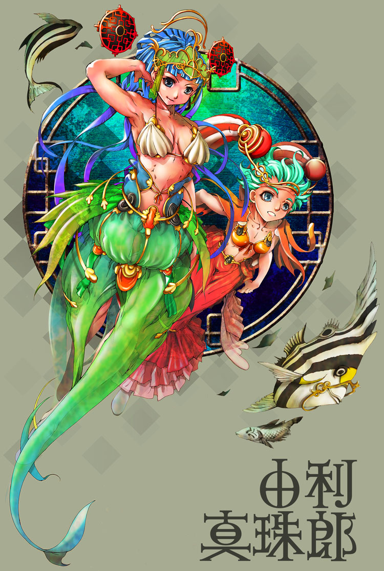 2girlsarmpitsbikinibikini top onlyblue eyesblue hairbreastsfishflat chestgreen hairlarge breastslong hairmultiple girlsponytailseashellshellshort hairswimsuit