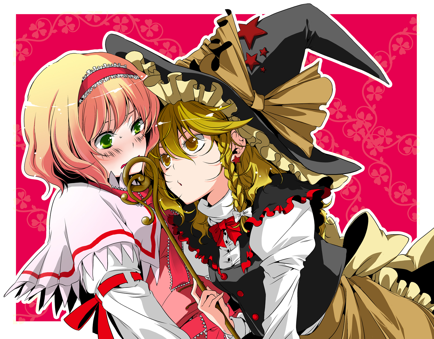 2girlsblonde hairblushbraidfemale focushairbandhatmultiple girlsribbonwandwitchwitch hatyellow eyes
