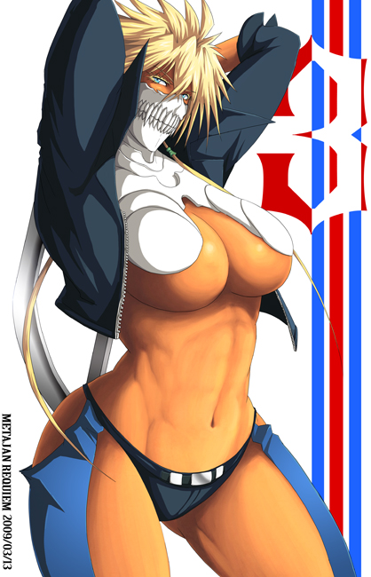 1girlabsarms uparrancarartist nameassass cutoutblonde hairblue eyesbreastschapsclothing cutoutcosplaycrossovercrotch cutoutcurvydark skindark-skinned femaledatedfemale focusgroinlarge breastslooking at viewermidriffnavelnumber tattoopantsrevealing clothessolotantattoothongunderboob