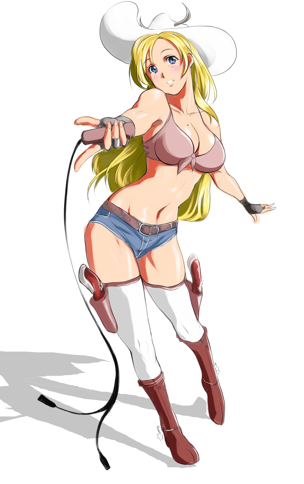 1girlblonde hairblue eyesbootsbreastscleavagecowboy bootscowboy hatcowboy westerndenimdenim shortsfemale focusfingerless glovesfrecklesfull bodyglovesgunhatlarge breastslegslong hairmidriffmolemole on breastnavelshort shortsshortssolostandingthigh strapthighhighsweaponwhipwhite thighhighs