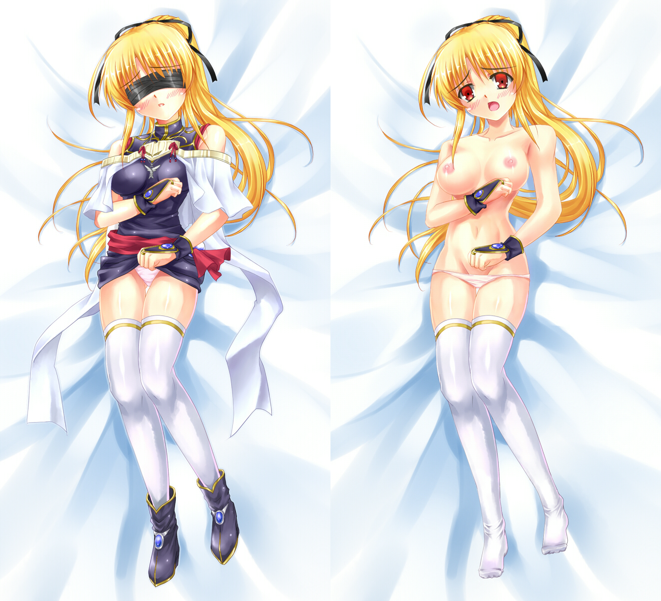 1girlblindfoldblonde hairblushbreastsbridal gauntletscapeletclothes liftcollarbonedakimakura (medium)dressdress lifthair ribbonjewelrylarge breastslong hairlyingmultiple viewsnavelnipplesnudeopen mouthpantiespanty pullpendantpink pantiesponytailred eyesribbonsashshoesthighhighstopless femaleunderwearwhite thighhighszettai ryouiki