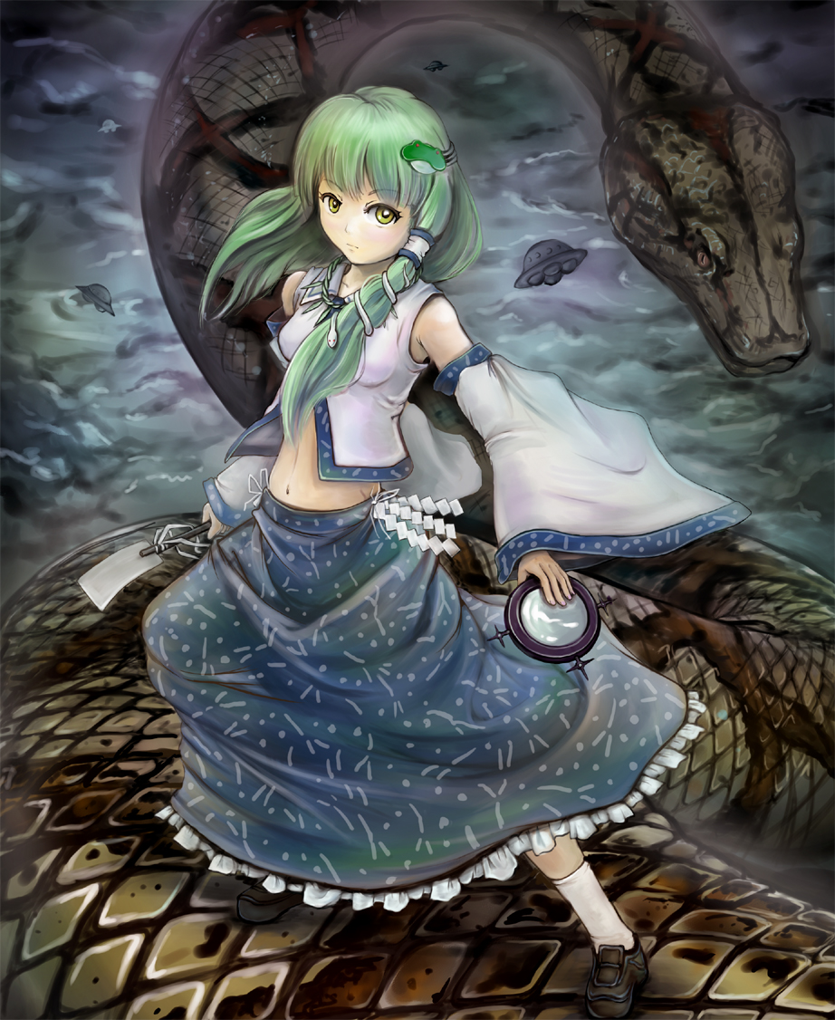 1girlanimaldetached sleevesfemale focusfighting stancefroggiant snakegreen hairhair ornamentholdingmidriffmirrornaveloversized animalseriousskirtsnakesoloufoyellow eyes