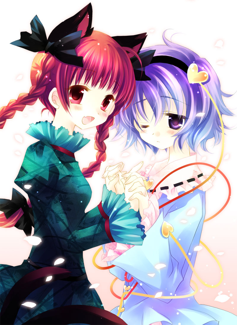 2girlsanimal earsbraidcat earscat girlcat tailfangfemale focushair ribbonhairbandheartholding handsmultiple girlsmultiple tailspurple eyespurple hairred eyesred hairribbonshort hairtailtwin braidstwintailswink