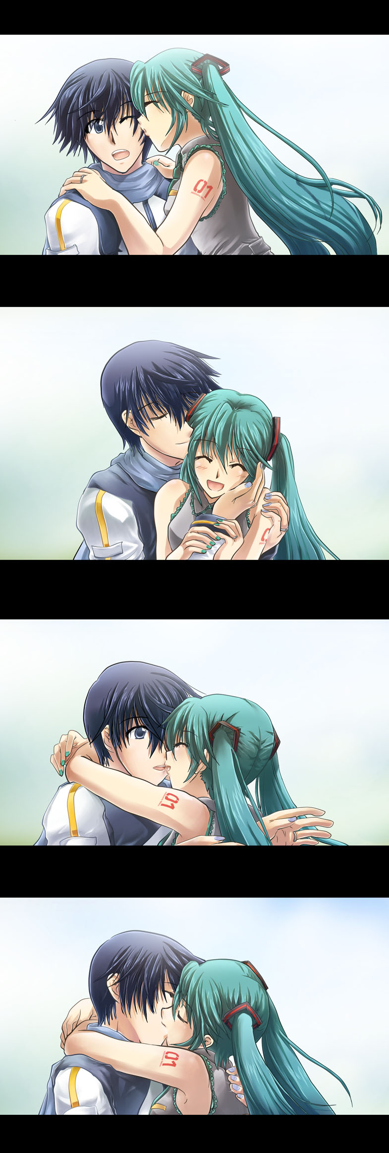 1boy1girlaqua hairblushcomiccouplegreen hairheterohugkisslong hairone eye closedopen mouthsmiletwintailsvery long hairwink