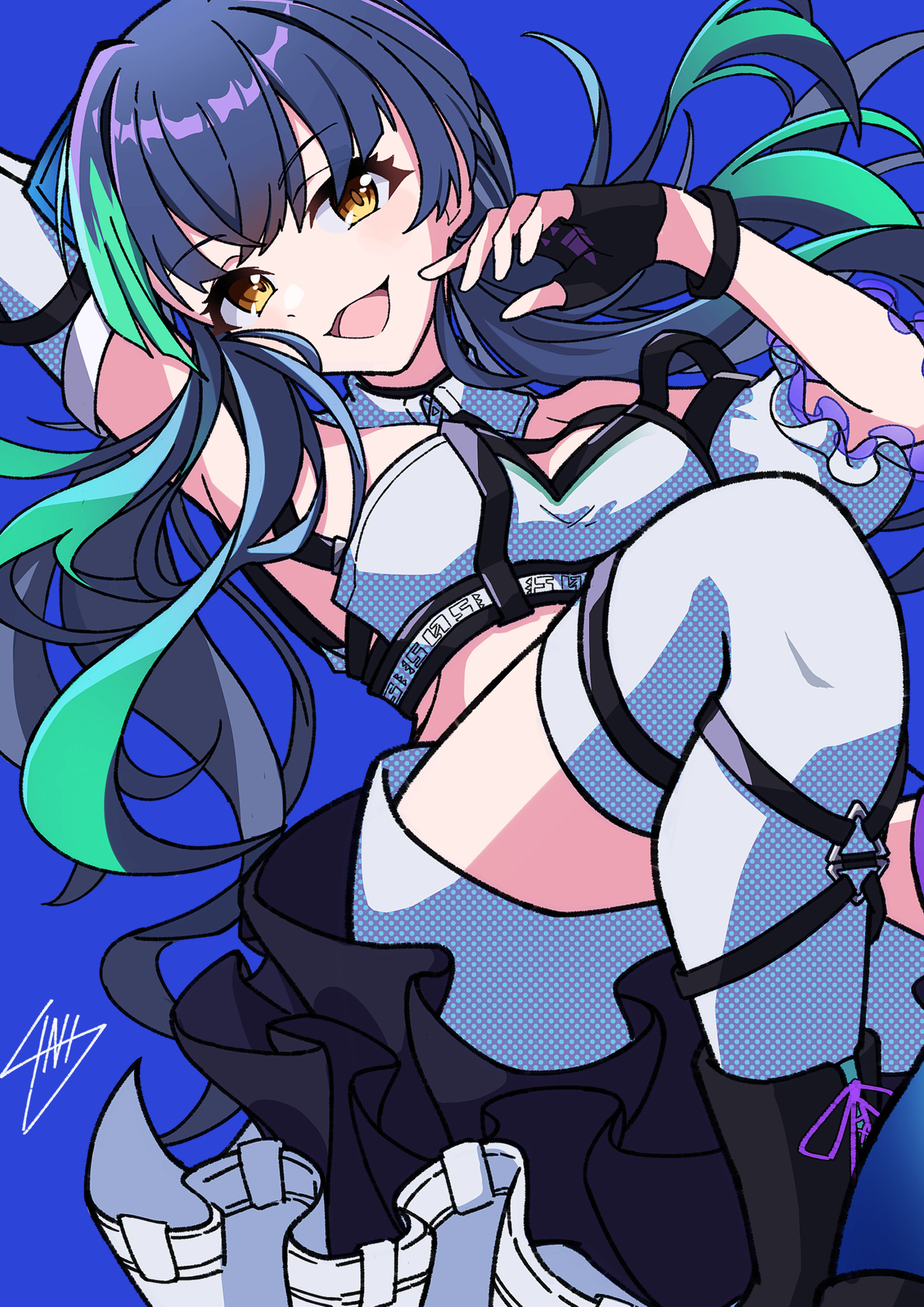1girlaqua hairarm upblack glovesblack hairblue backgroundbreastscrop topfingerless glovesfloating hairgloveslong hairlooking at viewermedium breastsopen mouthshortssimple backgroundsolothighhighswhite shortswhite thighhighsyellow eyes