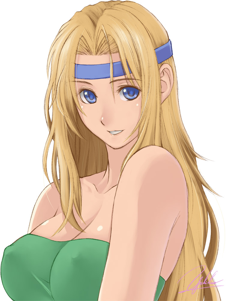 1990s (style)1girlbare shouldersblonde hairblue eyesbreastscovered erect nipplesfemale focusheadbandlong hairretro artstylesignaturesimple backgroundsketchsmilesolo