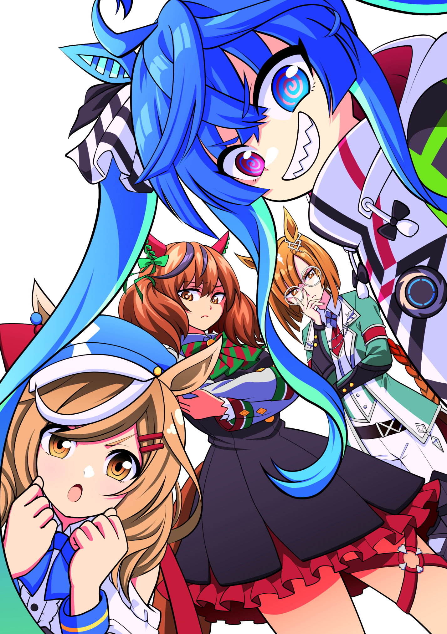1boy4girlsahogeanimal earsblack hairblue eyesblue hairbowbrown eyesbrown hairclenched handsclosed mouthglassesgreen bowgrey-framed eyeweargrinhair bowhair ornamenthairclipheterochromiahorse earshorse girllong hairlooking at viewermedium hairmulticolored hairmultiple girlsopen mouthparallel hairclipspink eyesround eyewearsharp teethshort hairshort twintailssimple backgroundsmileteethtwintailstwo-tone hairwhite backgroundwhite hair