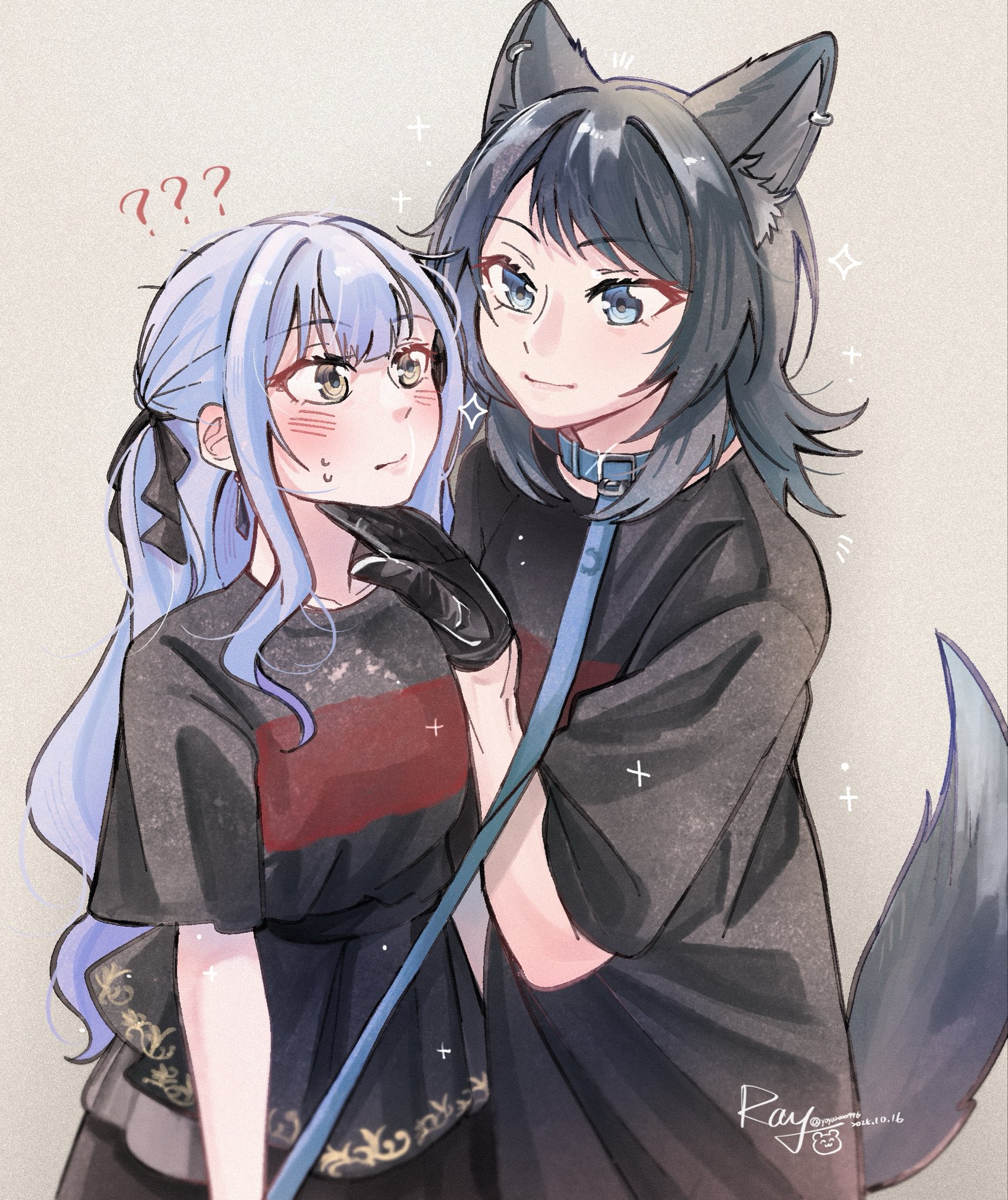 2girlsanimal earsblack hairblack ribbonblack shirtblue collarblue eyesblue hairbrown eyescollargrey backgroundhair ribbonhand on another's chinholdingholding leashkemonomimi modeleashlong hairmultiple girlsribbonshirtsidelockstailwolf earswolf girlwolf tailyuri