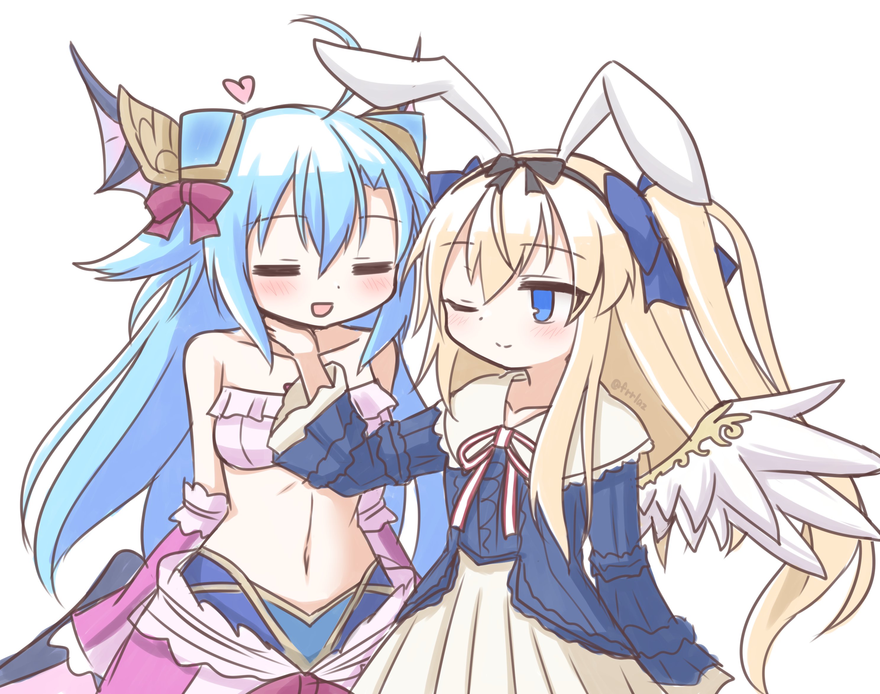 hiiro yuki, original, 2girls, blue background, brown eyes, brown hair, headphones, jumping, multiple girls, school uniform, serafuku, simple background, skirt