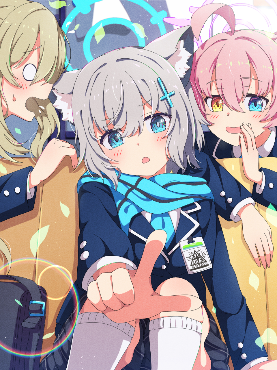 3girlsanimal earsblue eyesgrey hairhaloheterochromiamismatched pupilsmultiple girlspink hairscarfschool uniformwolf ears