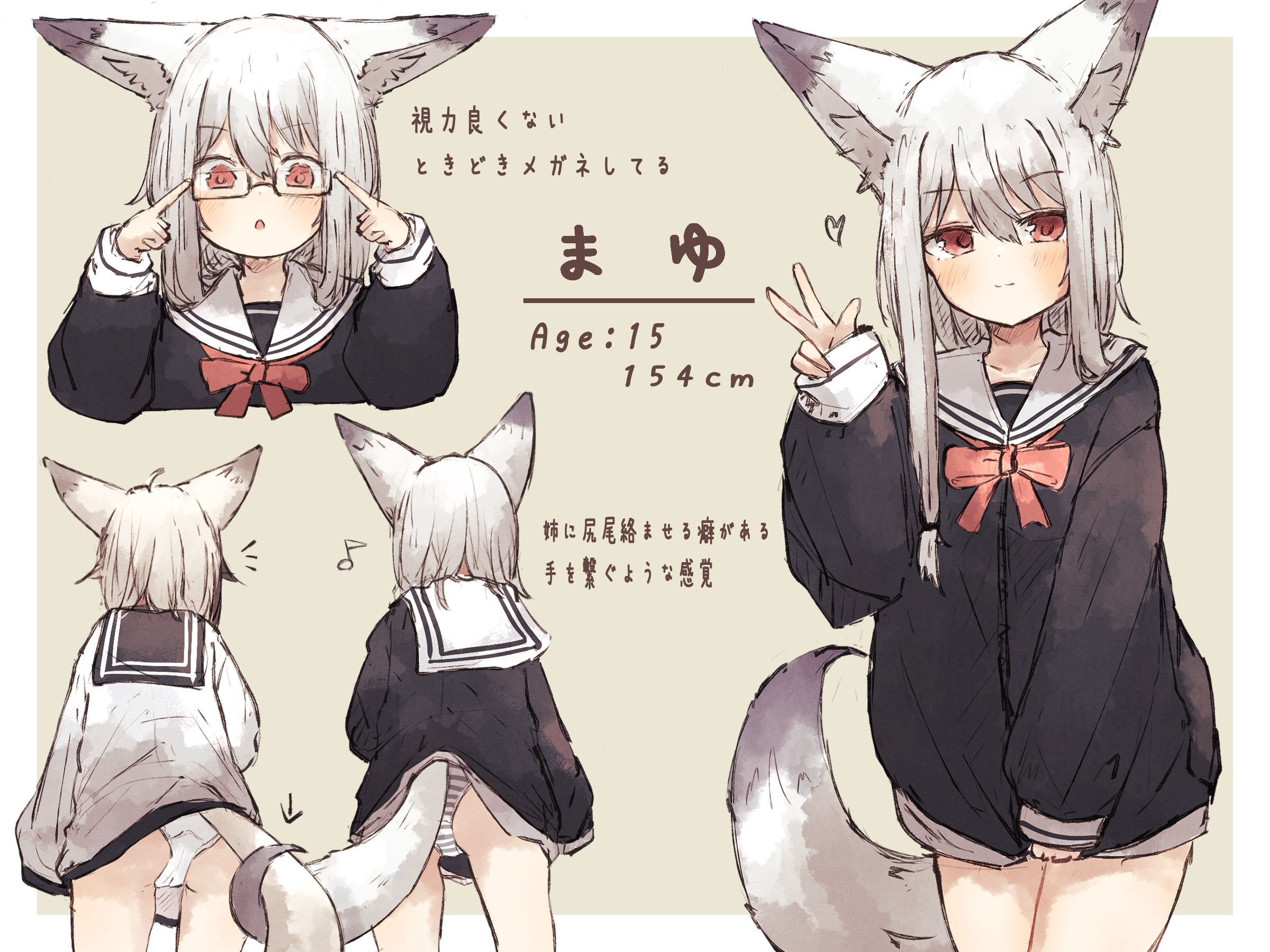 1girlanimal earsfox earsfox girlfox tailglassesmultiple viewsno pantspantiesred eyesstriped clothesstriped pantiestailunderwearwhite hair