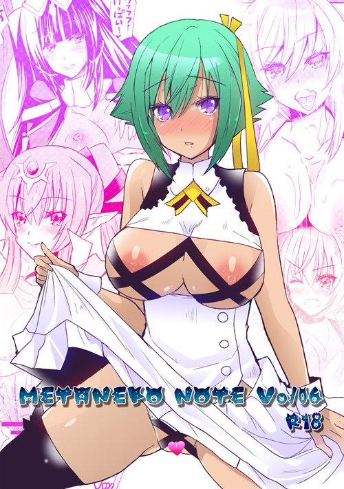 satomi (black scarecrow), kanisawa kinu, tsuyokiss, 1girl, :3, between legs, blonde hair, blue eyes, blue skirt, blush, collarbone, dutch angle, female focus, grey eyes, hair ribbon, hand between legs, looking at viewer, miniskirt, red ribbon, ribbon, shirt, short sleeves, sitting, skirt, solo, spread legs, stitches, striped clothes, striped thighhighs, t-shirt, thighhighs, zettai ryouiki