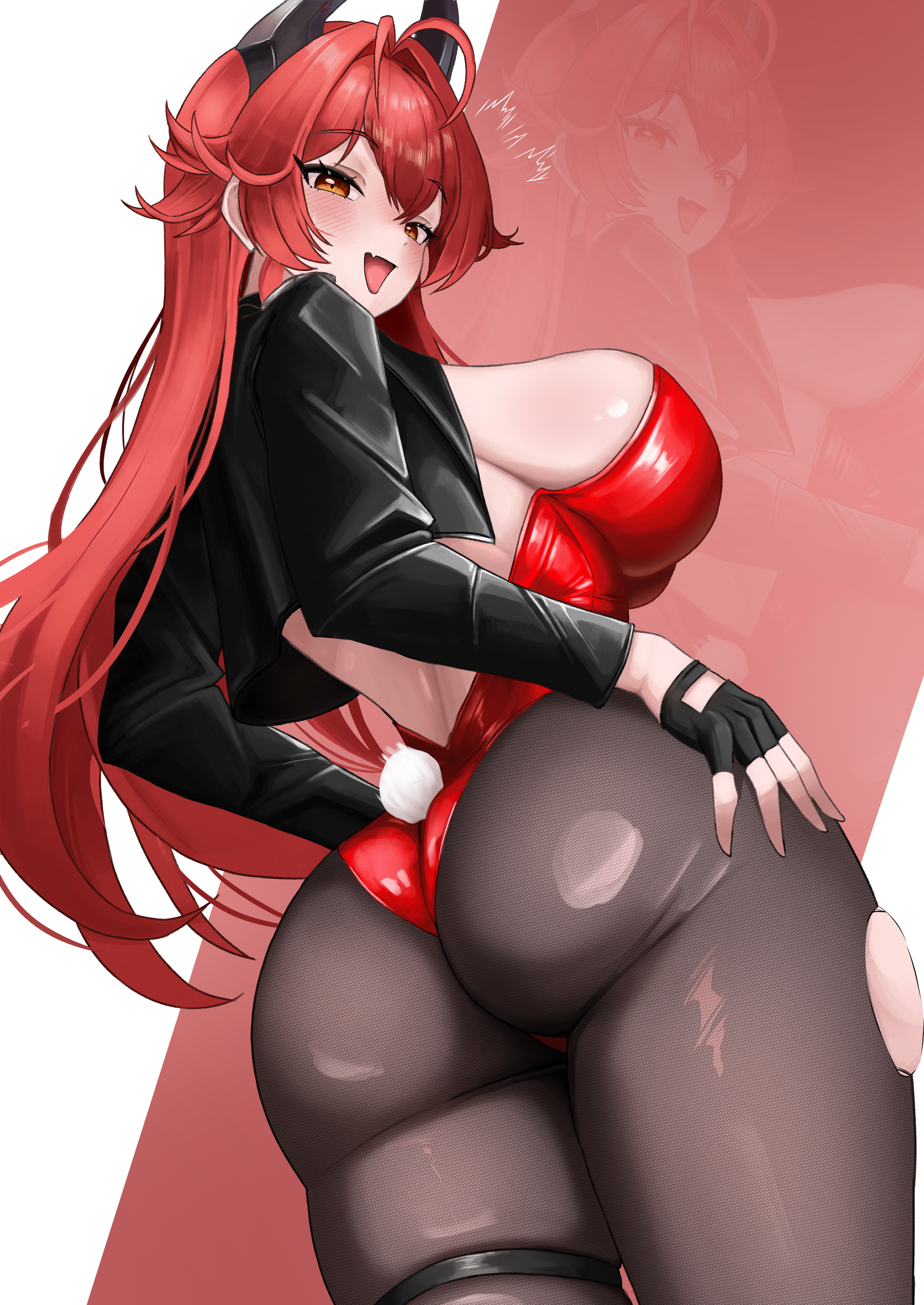 1girlalternate costumeantenna hairassblack glovesblack jacketblack thighhighsbreastsfake tailfingerless glovesfrom behindgloveshornsjacketlarge breastsleotardlong hairmechanical hornsorange eyespantyhoseplayboy bunnyrabbit tailred leotardsolotailthigh strapthighhighstorn clothestorn pantyhosevery long hairzoom layer