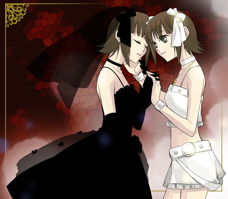 00s2girlsbare shouldersblack wedding dressblushbridal veilbridebrown hairchokercollarbonecool & sexy (idolmaster)dressdual personaholding handsmultiple girlsparted lipssee-through clothesskirtstandingsuspender skirtsuspenderssuspenders slipveilwedding dresswrist cuffsyuri