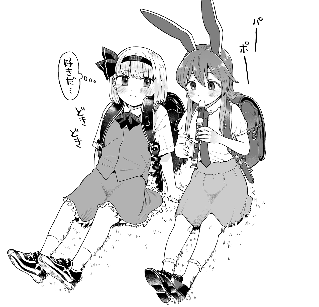 2girlsanimal earsbackpackbagblushbowbowtiecollared shirtcrescentcrescent pinflutefrilled skirtfrillsgrassgreyscalehair ribbonhairbandinstrumentlight frownlong hairmedium hairmonochromemultiple girlsmusicnecktieplaying instrumentrabbit earsrabbit girlrandoserurecorderribbonshirtshoesshort sleevessideways glancesittingskirtsneakerssockssound effectsspeech bubblethought bubblevestwhite background
