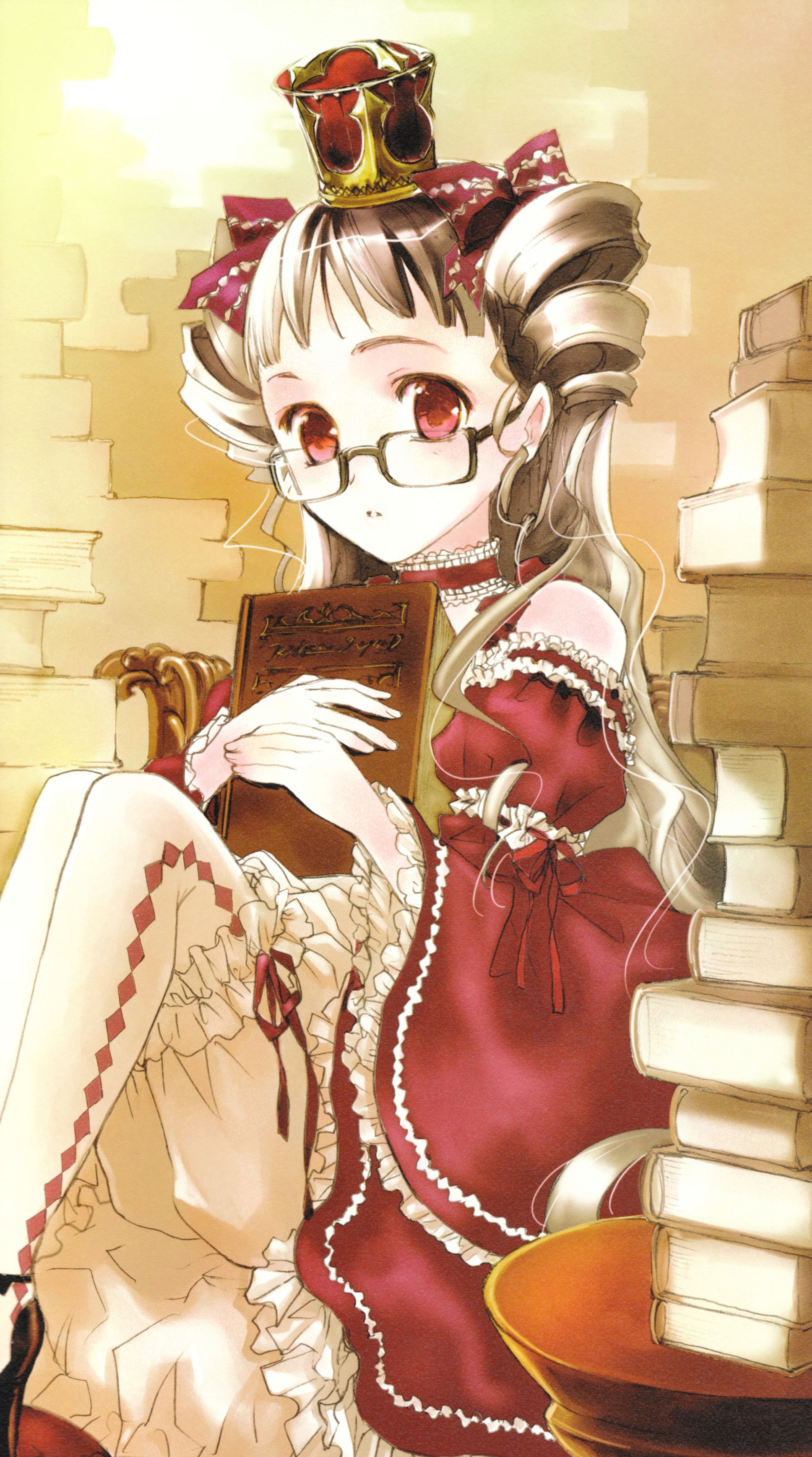 1girlargyle clothesbloomersbookbook stackchokercrowndressdrill hairfemale focusfrillsglassesholdingholding bookhugging bookhugging objectred eyessolounderwear