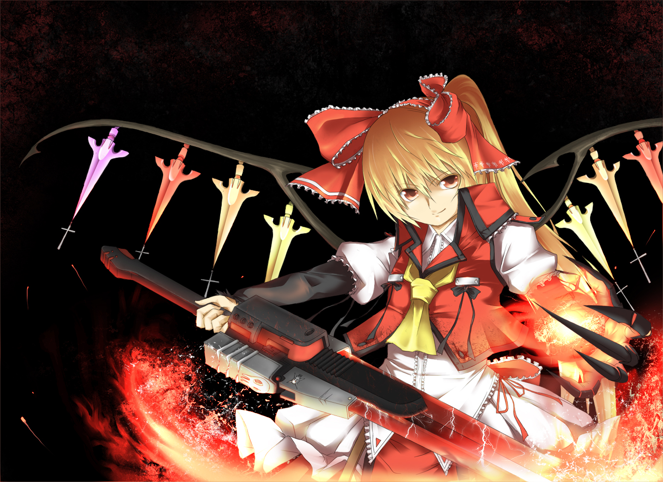 1girlalternate wingsblonde haircosplayfemale focusfirehair ribbonone side upred eyesribbonside ponytailsol badguy (cosplay)soloswordweaponwings