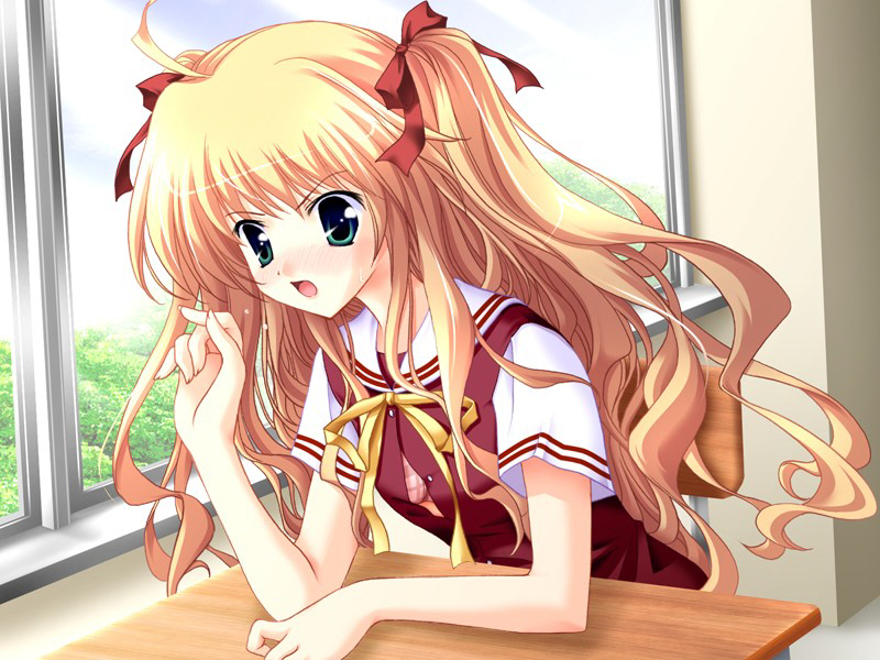 1girlahogeblonde hairbradeskfemale focusgreen eyeslingerielong hairopen clothesopen shirtschool uniformshirtsolotwintailsunderwear