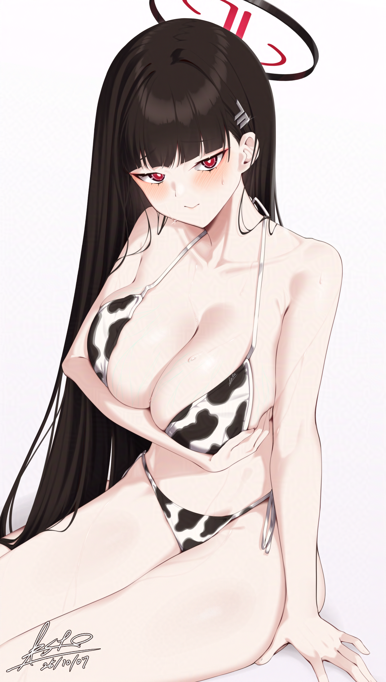 1girlanimal printarm under breastsbikiniblack hairblack halobreastscleavagecollarbonecow printcow print bikinidatedhalolarge breastslong hairlooking at viewerprint bikinired eyessignaturesimple backgroundsoloswimsuitthighsvery long hairwhite background