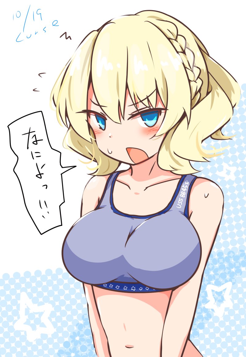 1girlangryartist nameblonde hairblue eyesblue sports brabraidbreastsdatedlarge breastsnavelopen mouthside braidssolosports braupper body