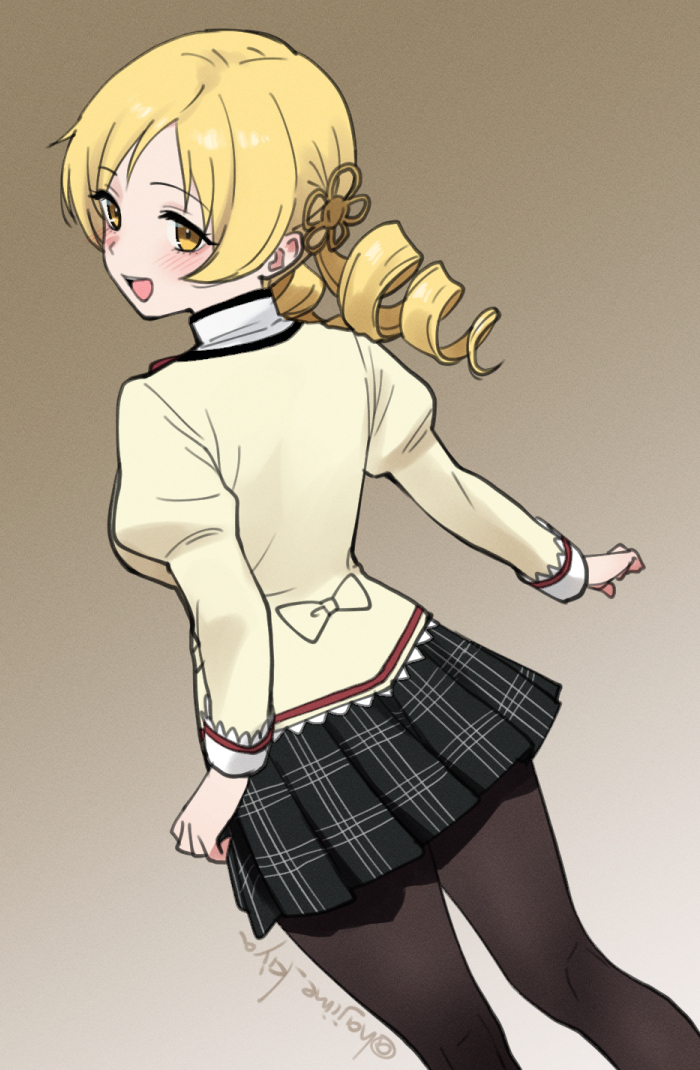 :d1girlblack pantyhoseblack skirtblazerblonde hairbrown backgrounddrill hairfrom behindgradient backgroundhand on own hipjacketlong hairlong sleevesmitakihara school uniformopen mouthpantyhoseplaid clothesplaid skirtschool uniformskirtsmilesolotonguetwin drillstwintailsyellow jacket