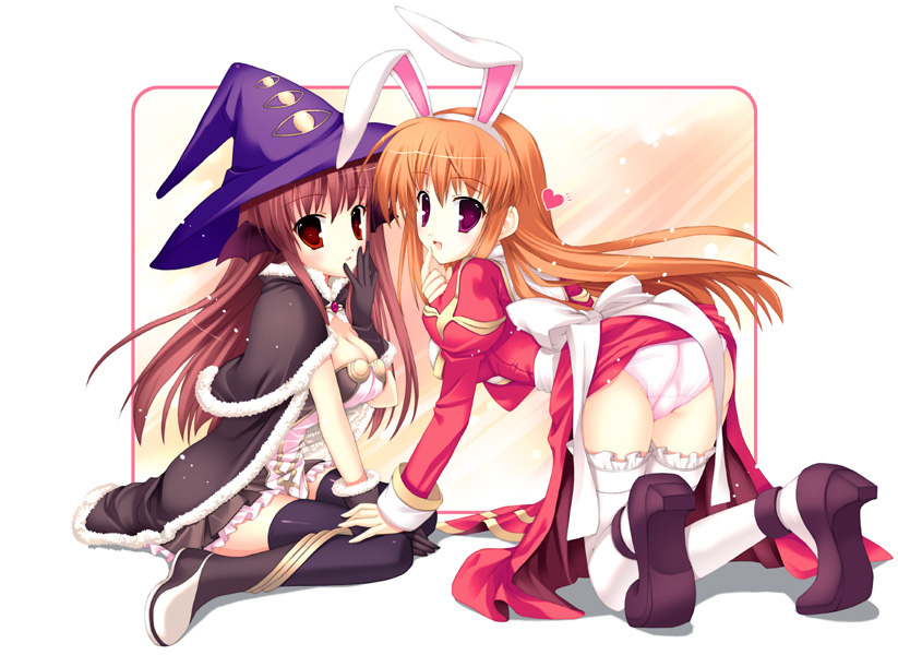 animal earsbowbrown haircapedressgloveshatheartlong hairpantiespurple eyesrabbit earsred eyessittingthighhighsunderwear