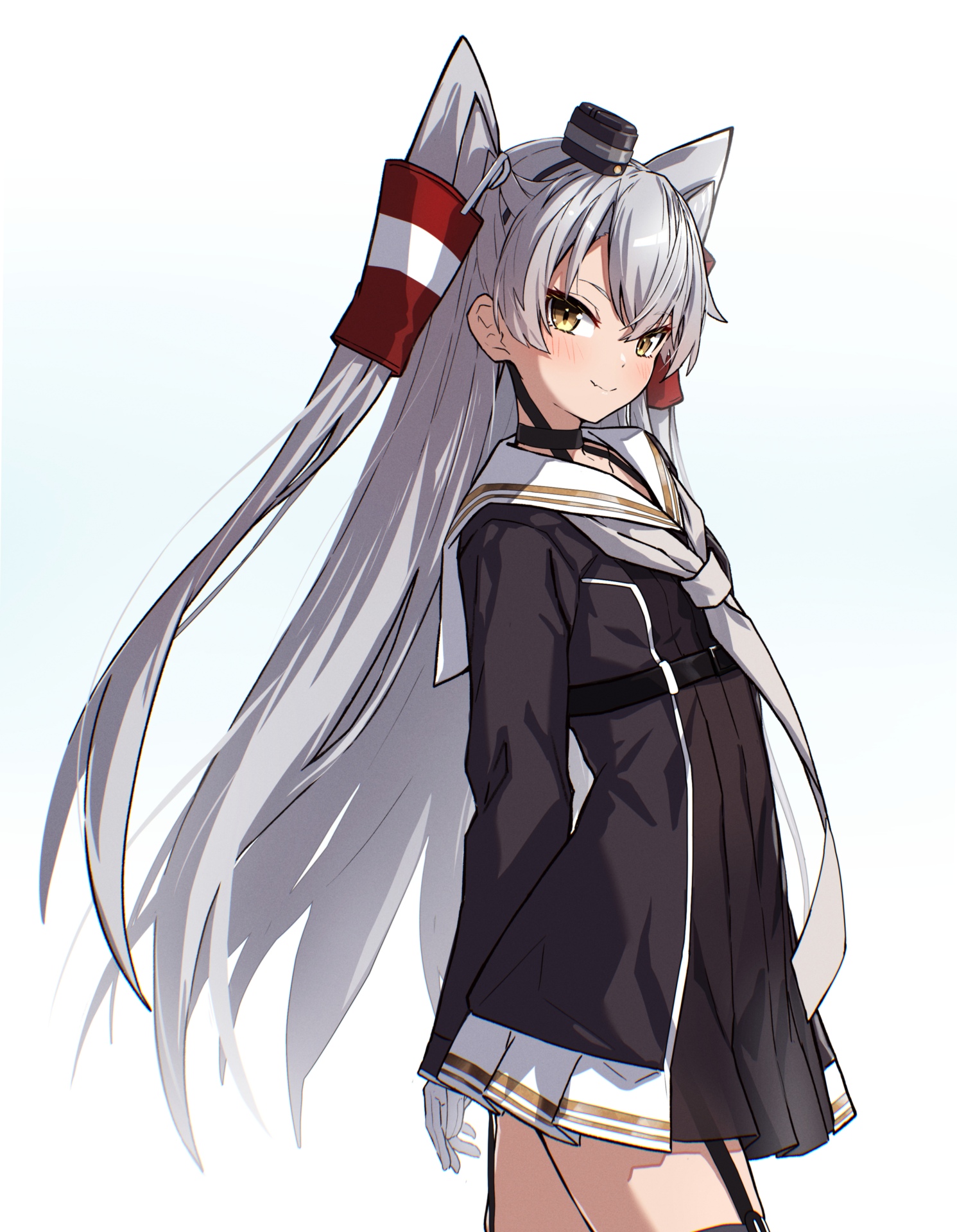 1girlblack dressbrown eyesclosed mouthcowboy shotdressfrom sidegarter strapsglovesgradient backgroundgrey hairhair between eyeshair tubeslight blushlong hairlong sleeveslooking at viewersailor collarsailor dresssmilesolostandingtwo side up