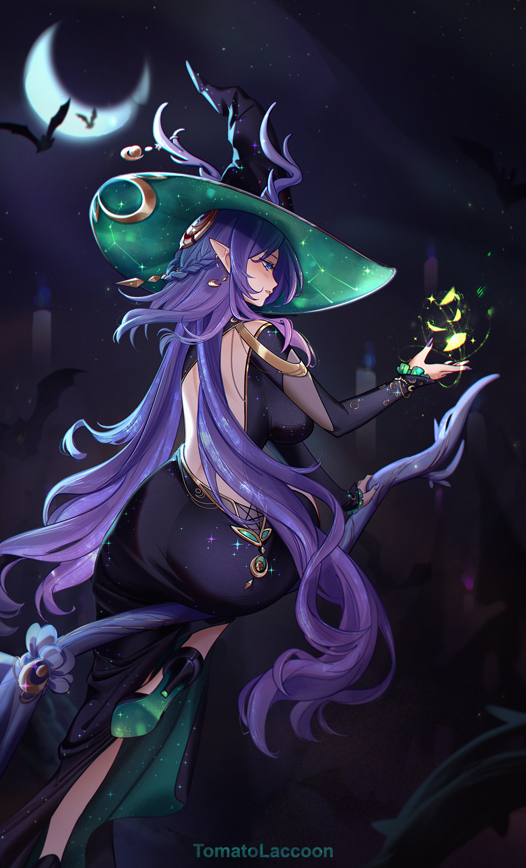 1girlalternate costumeartist nameassbackless dressbackless outfitbat (animal)black dressblue eyesbreastscrescent moondressfrom behindhathigh heelslarge breastslong hairmoonnail polishnightnight skyobject floating above handparted lipspointy earspurple hairpurple nailssittingskysolowitch hat