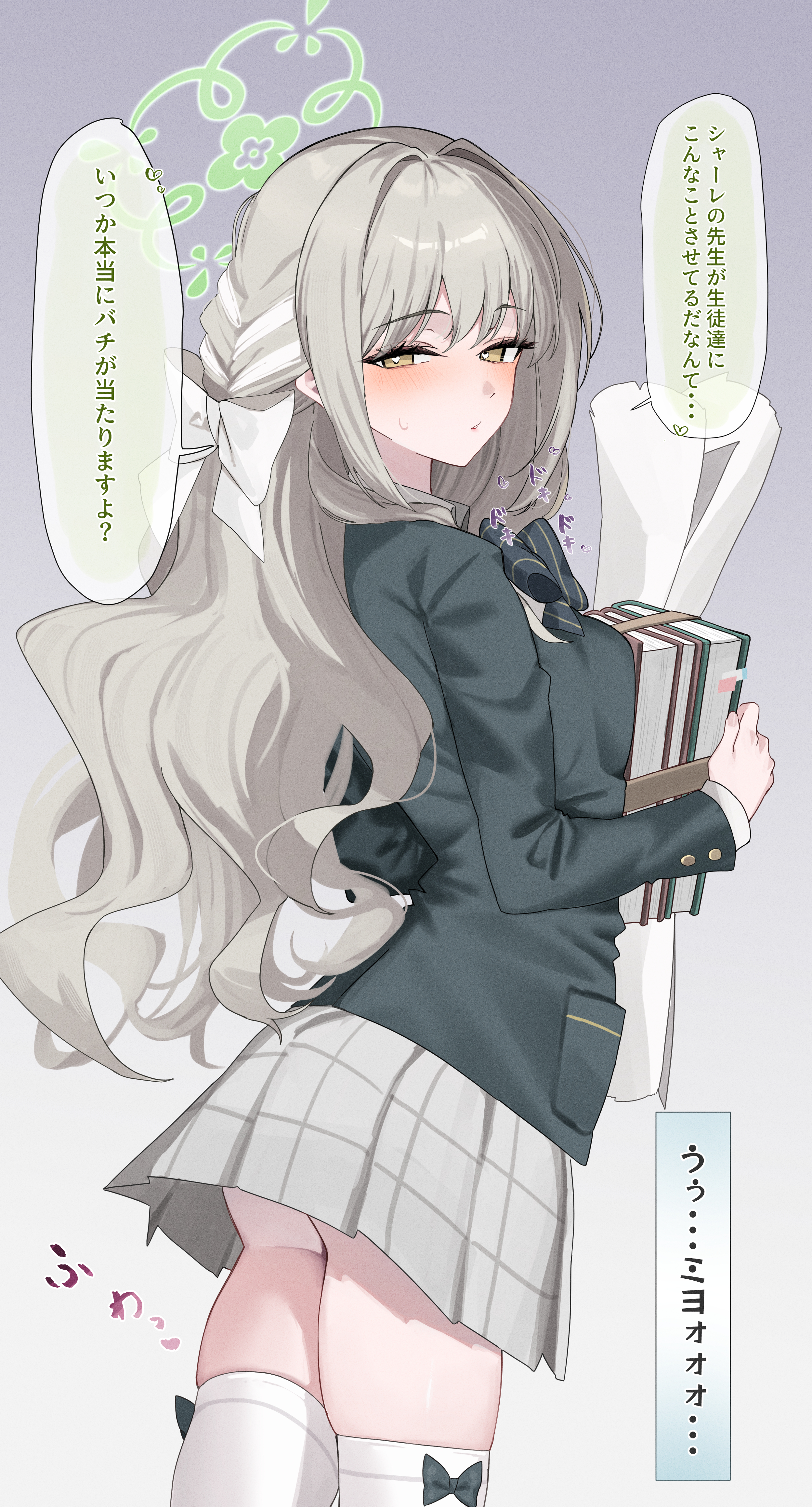 1girlblack jacketblushbookbowbraidbrown eyesgrey hairgrey skirthaloheartheart-shaped pupilshugging objectjacketlong hairlong sleeveslooking at viewerparted lipsplaid clothesplaid skirtschool uniformscrollside braidsidelocksskirtsolostandingsymbol-shaped pupilsthighhighsunderbustwhite backgroundwhite bowwhite thighhighs