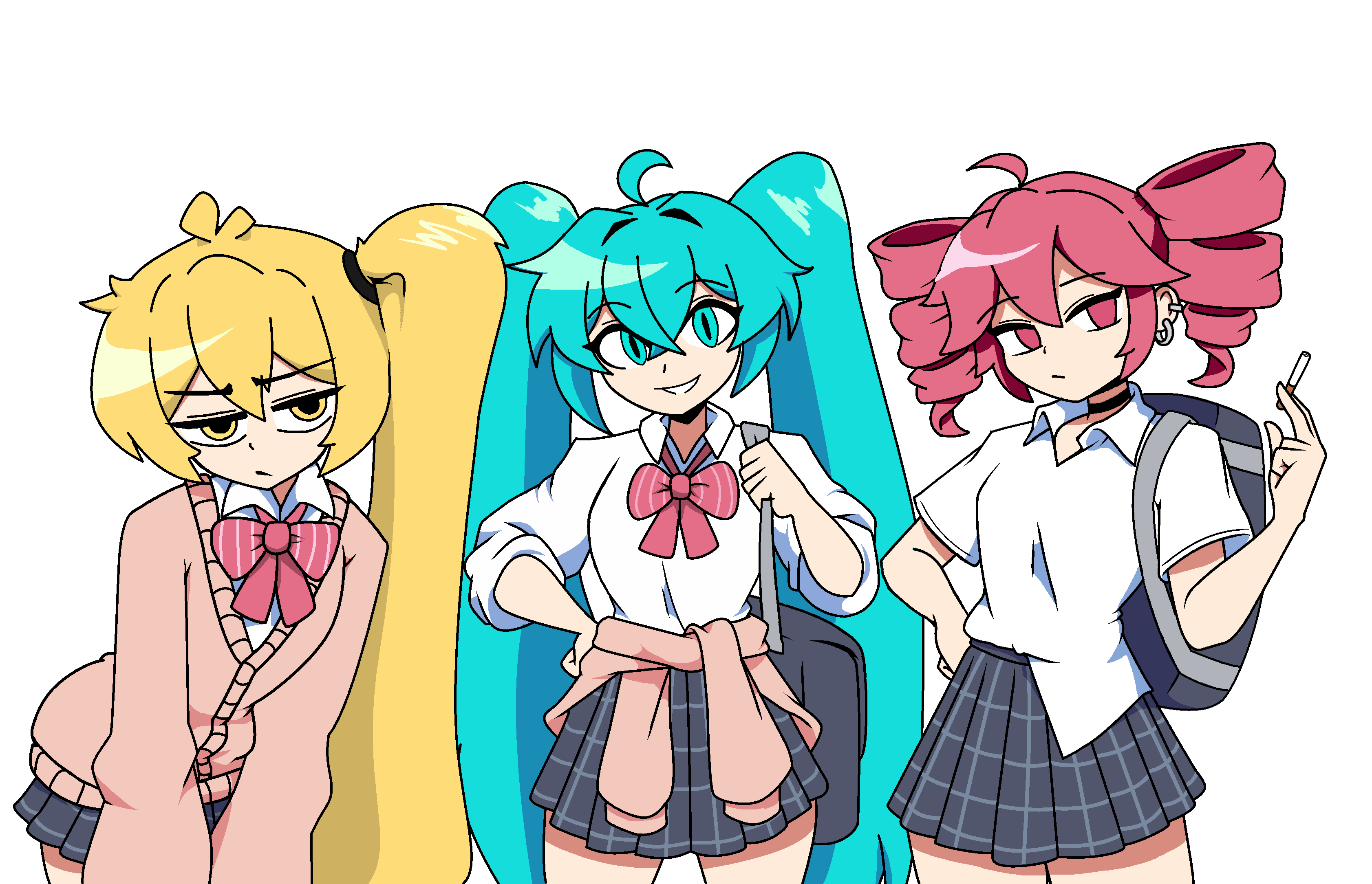 3girlsahogeaqua eyesaqua hairbagblack bagblonde hairbowbowtiecardigancardigan around waistcigaretteclothes around waistcrossed bangsdrill hairear piercinggrey skirthair between eyesholdingholding cigaretteirisusdejitomelong hairlooking at viewermultiple girlspiercingpink bowpink bowtieplaid clothesplaid skirtred eyesred hairschool swimsuitshirtshoulder bagside ponytailsimple backgroundskirtsmileswimsuittwin drillstwintailswhite backgroundwhite shirt