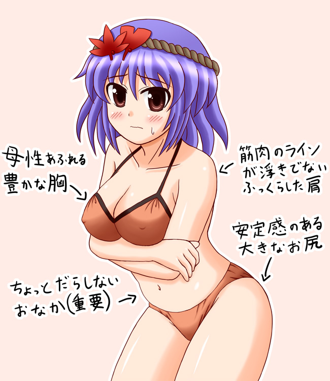 1girlbikinibreastscovered erect nipplesfemale focushair ornamentlarge breastsleaf hair ornamentorange bikinipurple eyespurple hairshort hairsoloswimsuit