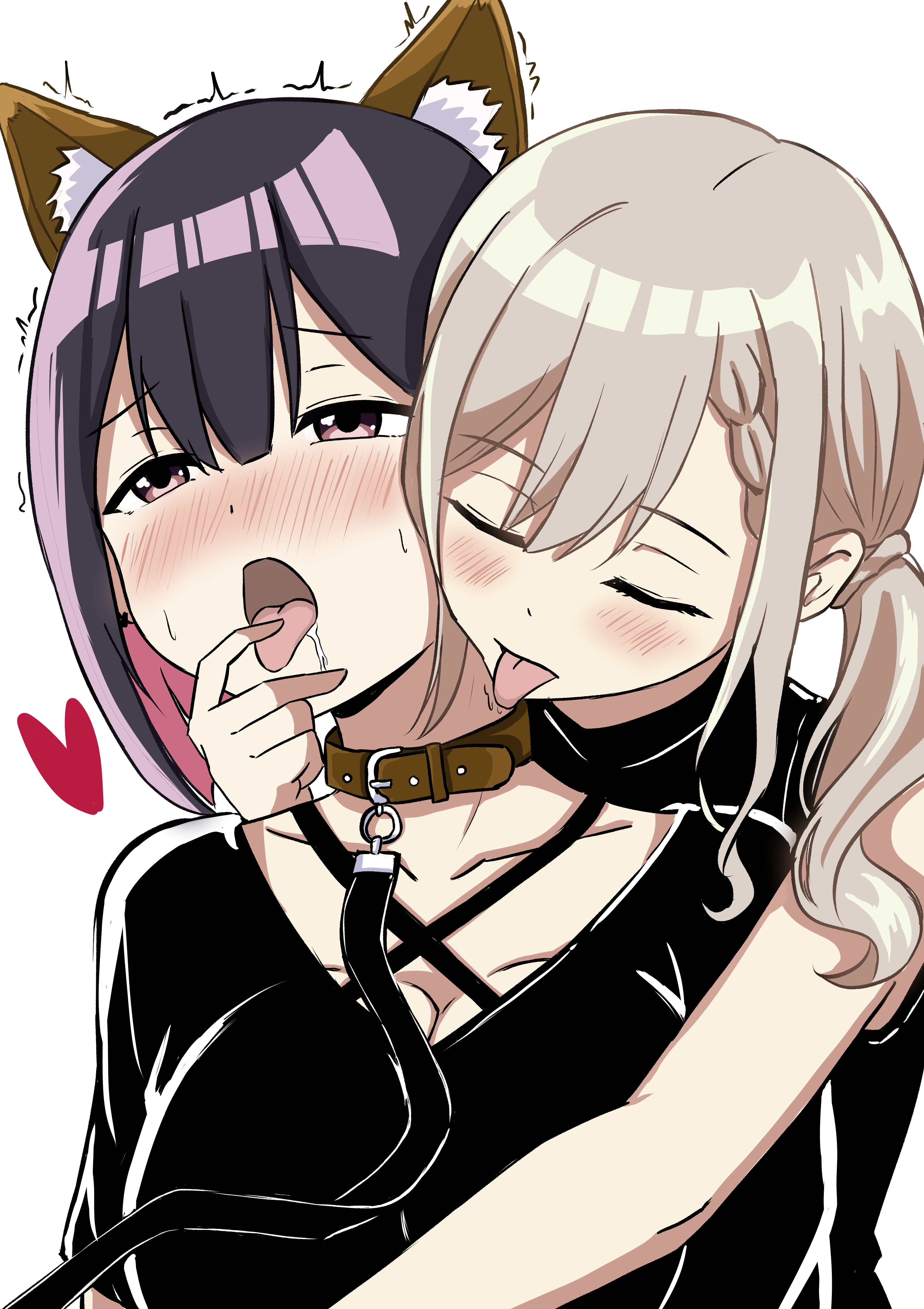 2girlsanimal earsblack hairblonde hairblushbreastsbrown eyescleavageclosed eyescollarcollarbonedog earsfake animal earsfinger in another's mouthlarge breastsleashlickinglong hairmultiple girlsopen mouthsalivashort hairside ponytailsimple backgroundsleevelesstonguetongue outupper bodywhite backgroundyuri