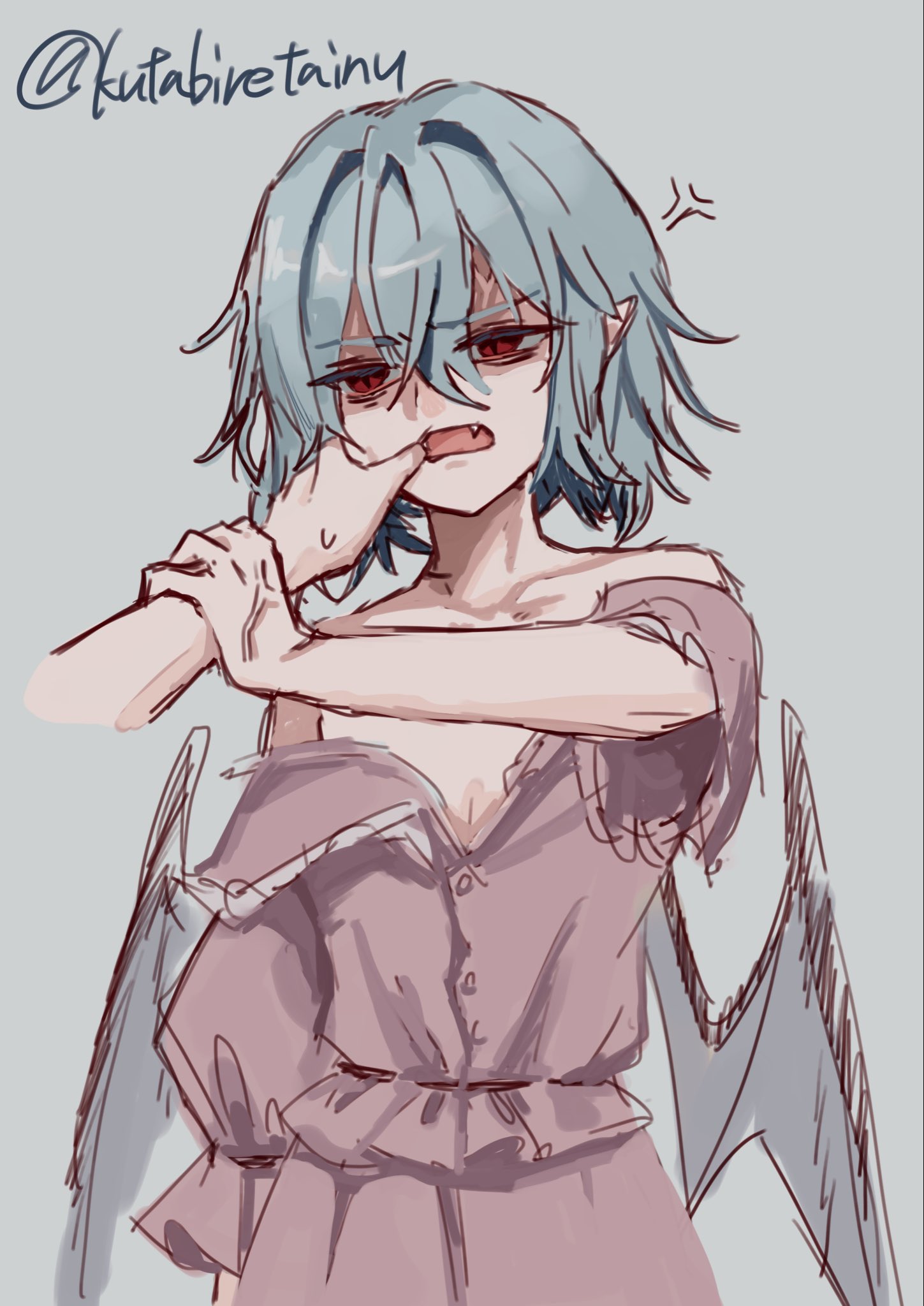 1boy1girlanger veinannoyedarm upbare shouldersbat wingsblue hairdisembodied handdouble-parted bangsfangfinger in another's mouthflat chestfurrowed browgrabbing another's armgrey backgroundhair between eyeshair intakeshalf-closed eyesoff shoulderopen mouthpointy earspuffy short sleevespuffy sleevespurple shirtpurple skirtred eyesshirtshort hairshort sleevessimple backgroundskirtskirt setslit pupilssolo focustwitter usernameveinsveiny handswings