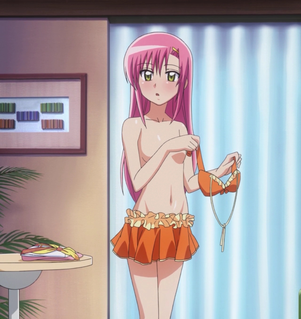 00s1girlbikiniblushfemale focusflat chestgreen eyeshair ornamenthaircliplong hairopen mouthorange bikinipink hairsolostandingswimsuittopless female