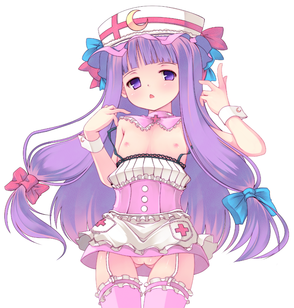 1girlbowbreastscleft of venuscrescentcrescent hat ornamentfemale focusflat chestgarter belthathat ornamentlolilong hairno brano pantiespink bowpurple eyespurple hairpussysolostandingthighhighsvery long hairwrist cuffs