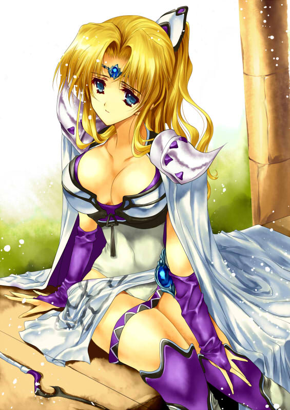 1990s (style)1girlarmorblonde hairblue eyesbootsbreastsbridal gauntletscapecircletcleavagecrownfemale focusfingerless glovesgloveslarge breastslegslong hairoutdoorsponytailsolothigh bootsthighhighsthighs