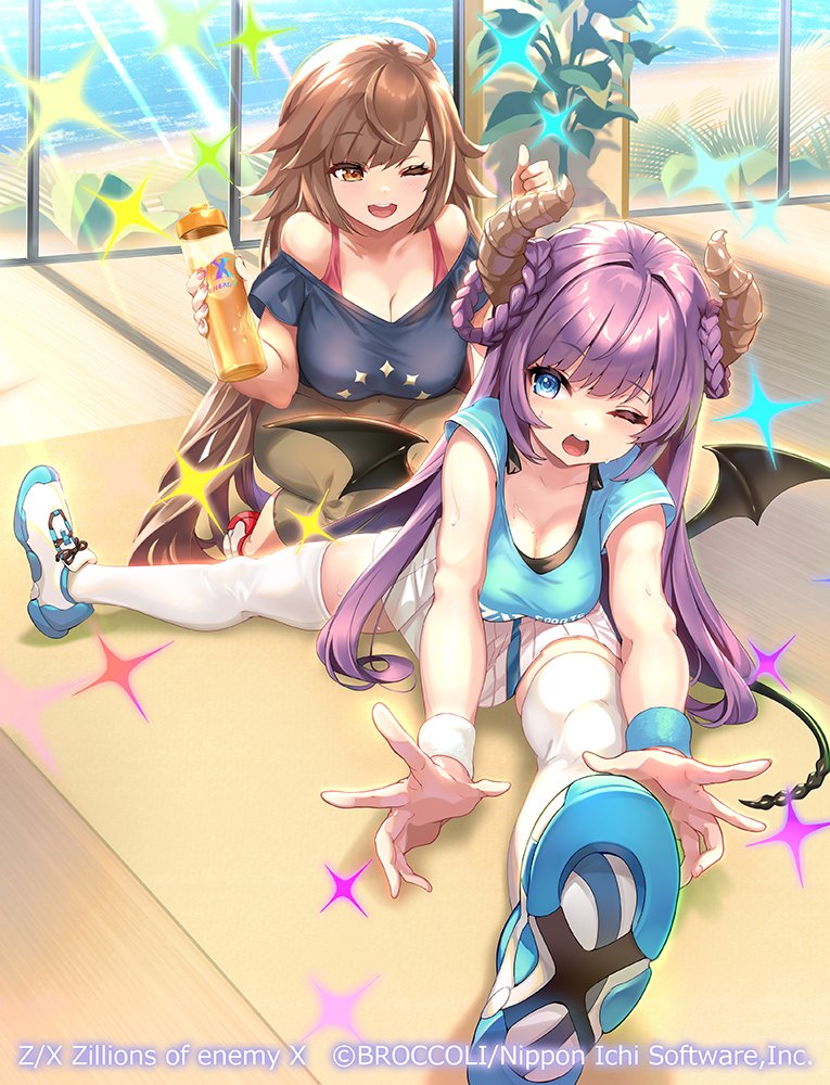 2girlsahogeaqua shirtaqua shoesblue eyesblue shirtbottlebraidbraided hair ringsbreastsbrown eyesbrown hairbrown hornsbrown pantscleavagecopyright noticedemon girldemon hornsdemon taildemon wingsexercisinghair ringsholdingholding bottlehornsindoorslarge breastslong hairmulticolored shoesmultiple girlsoceanone eye closedopen mouthpantsplantpotted plantprism (z/x)purple hairshirtshoessittingskirtsparklesports bottlespread legssquattingstretchingsweatsweatdroptailteeththighhighsthumbs upugly (z/x)upper teeth onlywhite shoeswhite skirtwhite thighhighswindowwings