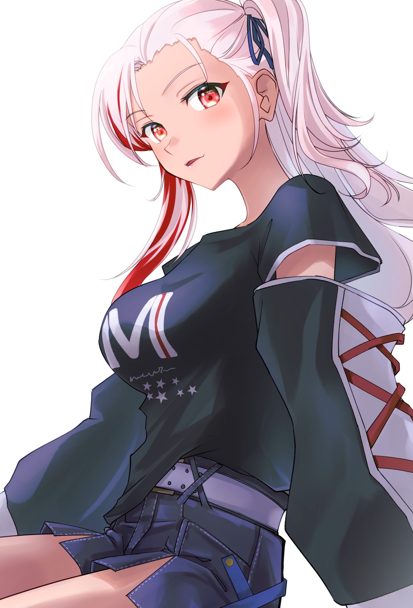 1girlalternate costumebeltblack shirtblack shortsblonde haircowboy shotmulticolored hairone side upred eyesred hairshirtshortssimple backgroundsolostreaked hairwhite backgroundwhite belt