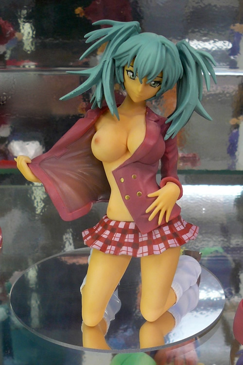 ryofu housen, ikkitousen, highres, 00s, 1girl, bent over, bikini, blush, breasts, cleavage, female focus, green eyes, green hair, halterneck, matching hair/eyes, solo, swimsuit, twintails, yellow bikini