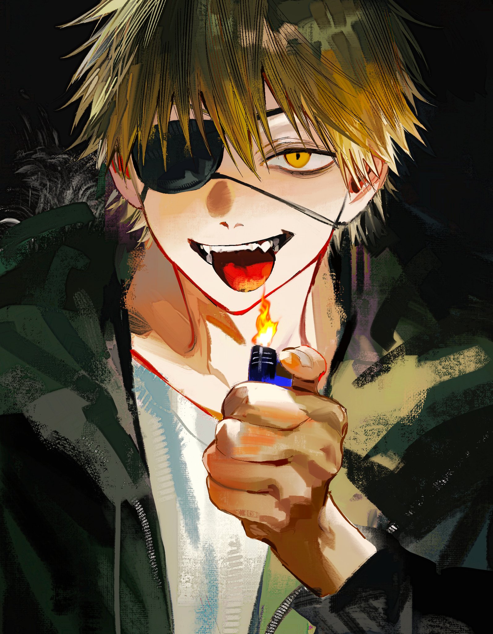 1boyavandee11949black jacketblonde haireyepatchfireholdingholding lighterjacketlighterlooking at viewermale focusopen mouthshirtshort hairsoloteethtonguetongue outwhite shirtyellow eyes
