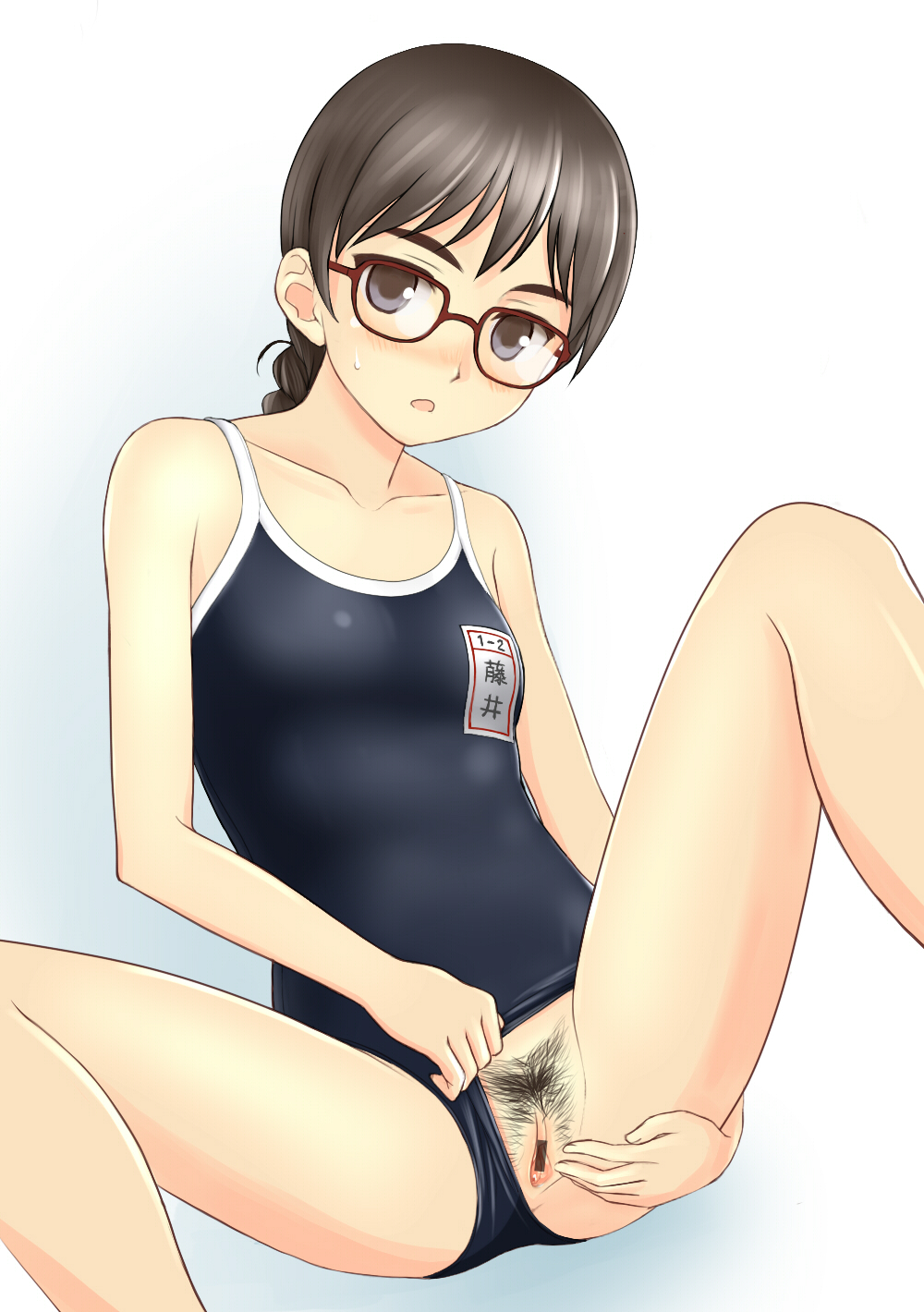 black hairblue eyesblushfemaleFlag for Deletionglassesopen mouthpointless censoringponytailpubic hairpussyschool swimsuitsoloswimsuit asidetied hair