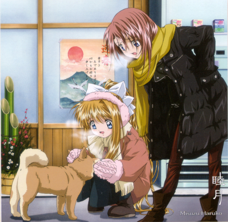 00sblonde hairblue eyescoatdoghair ribbonkeylong hairmittensred hairribbonscarfshiba inuvending machine