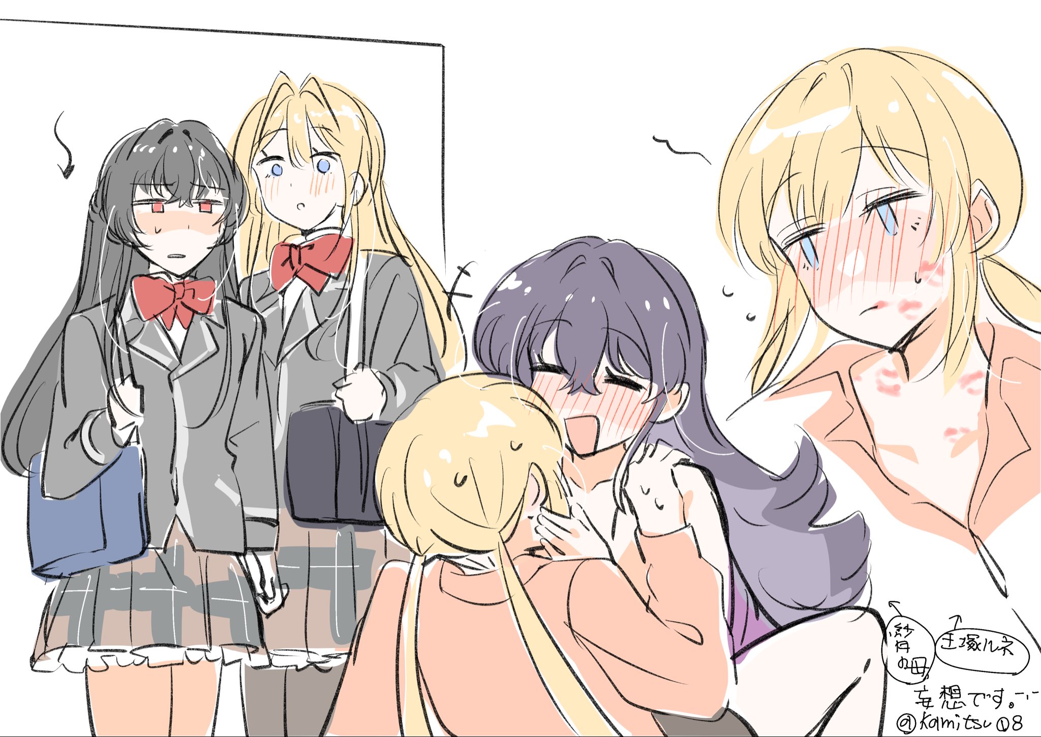 4girlsblack hairblazerblonde hairblue eyesbowbowtiebraidbrown skyeishin29grey jackethalf up braidjacketkoto satsuki's motherlipstick marklipstick mark on facelong hairmother and daughtermultiple girlsopen mouthorange shirtouzuka reneeplaid clothesplaid skirtpurple hairred bowred bowtiered eyesshirtsimple backgroundskirtwhite backgroundyuri
