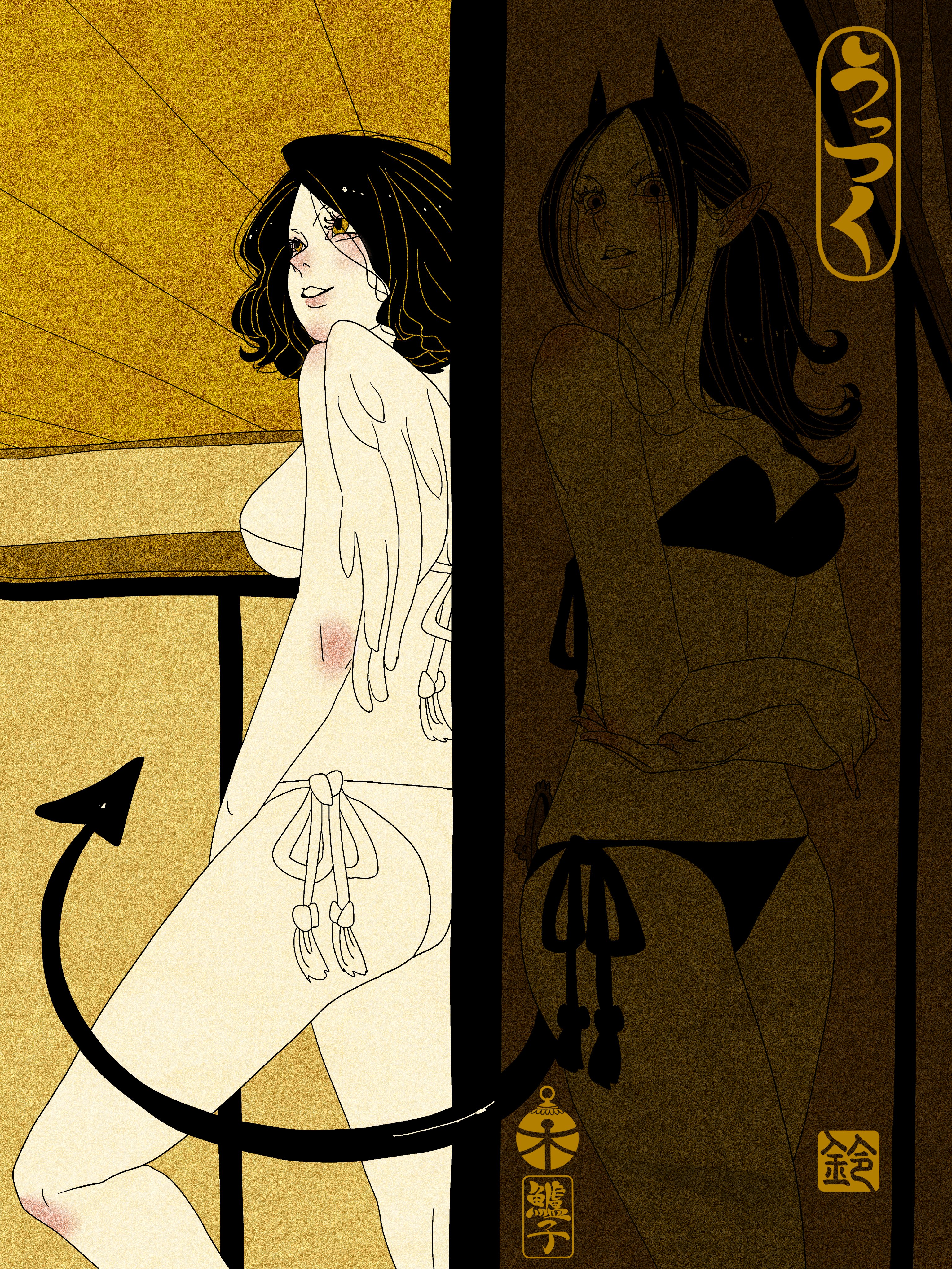 2girlsangelangel wingsartist logobikiniblack bikiniblack hairdemon girldemon hornsdemon tailfeathered wingshornslogolong hairlooking at viewerlooking to the sidemedium hairmultiple girlsparted lipsside-tie bikini bottomsidelocksstandingswimsuittailwhite bikiniwhite wingswings